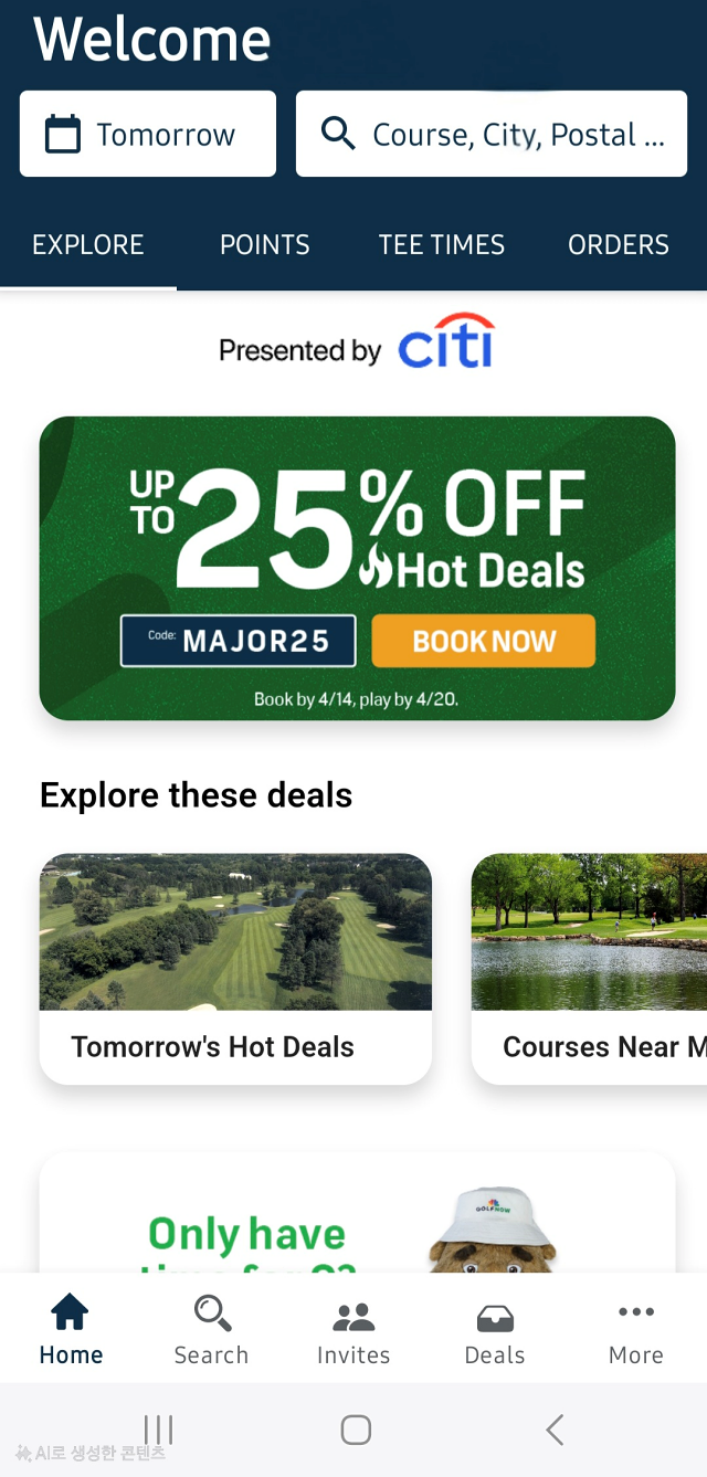 - GolfNow Hot Deal과 유사한 Deals 메뉴에서 할인 타임 찾아보세요